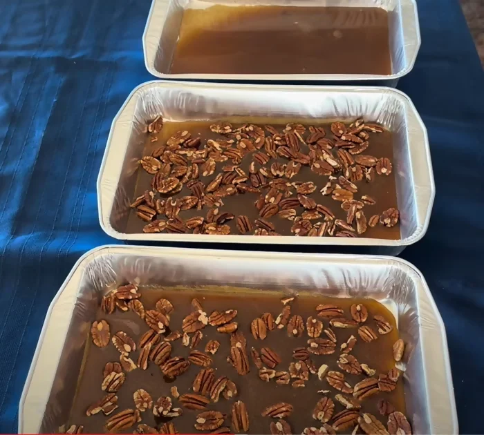 In the meantime, prepare the sticky bun sauce and cinnamon filling by boiling a combination of butter, milk, sugar, and nuts.