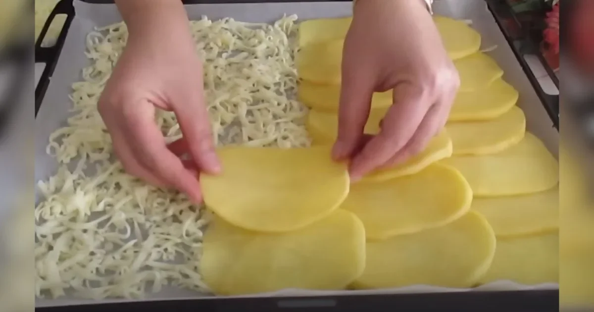 Add the potato slices now. Spread them out on the tray with the cheese.