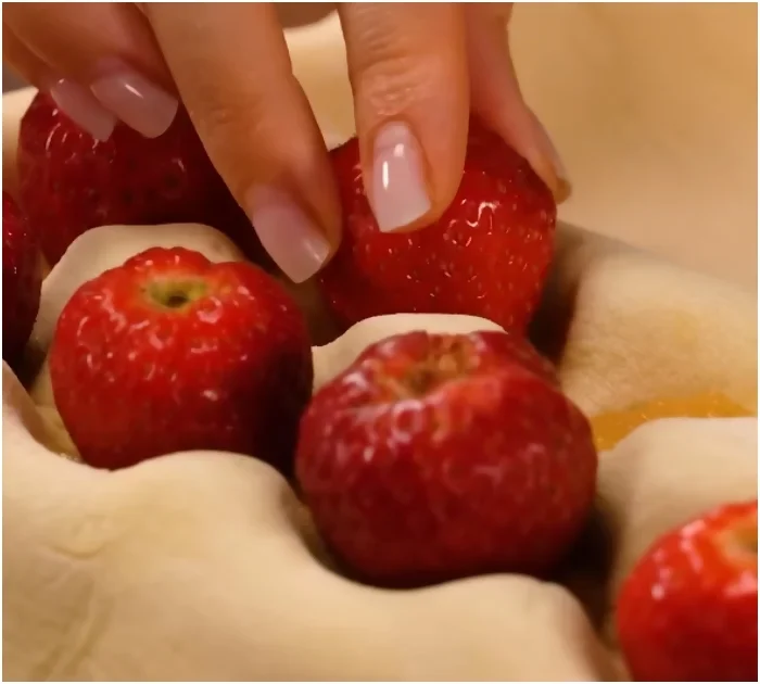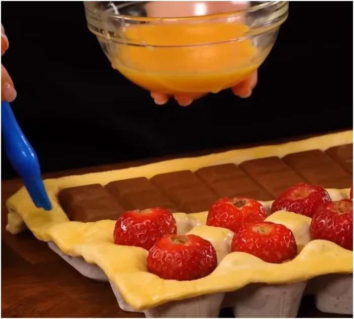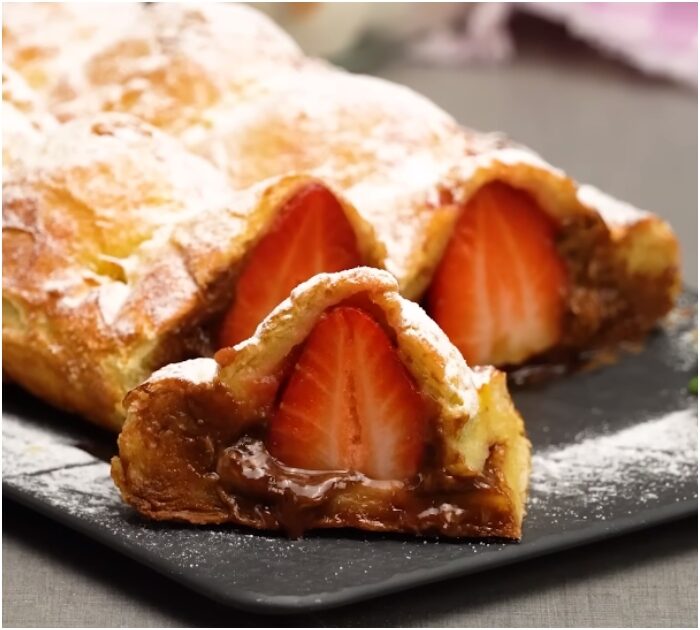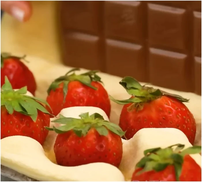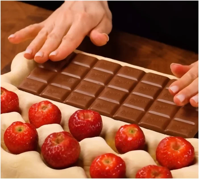 Encased in flaky puff pastry, the combination of creamy milk chocolate, juicy strawberries, and soft apples is just tempting.