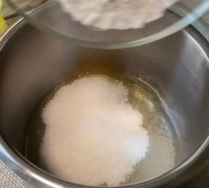 Crack the eggs in a bowl and mix in the sugar and vanilla sugar.