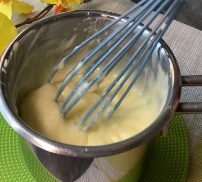 Put the pan on the fire and add the milk. Stirring constantly, heat the mixture until it thickens.
