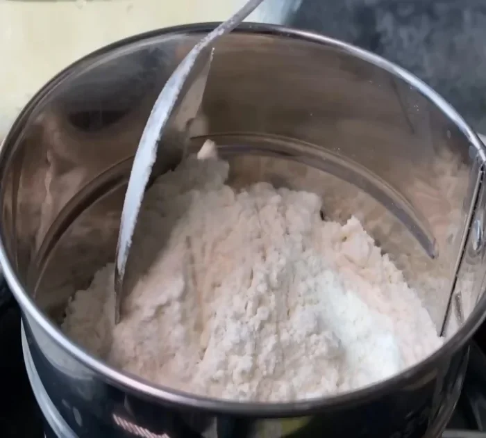 Add the sour cream and then the vegetable oil. Add the baking powder and 250 grams of flour and sift them into the batter.