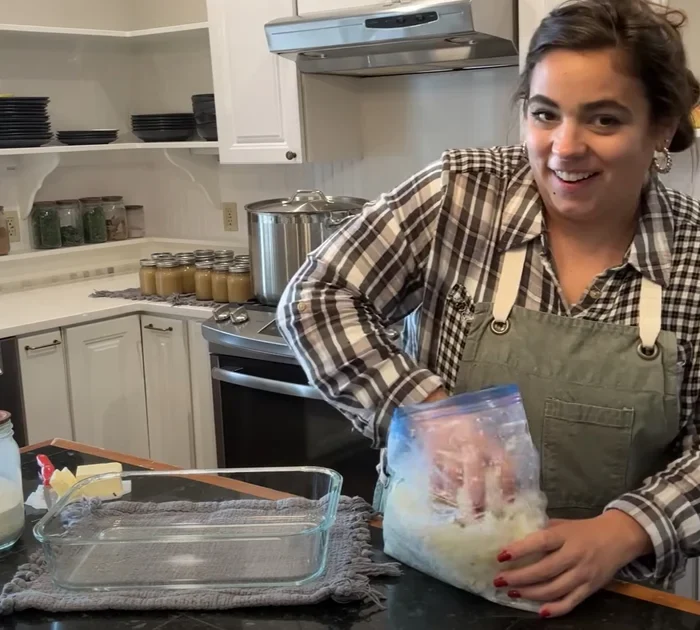 Becky remembers her days on the homestead as she stacks the casseroles.