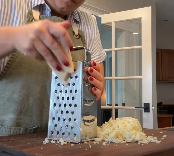 She covers the casserole with a mixture of sharp cheddar, creamy mozzarella, and a touch of parmesan cheese.
